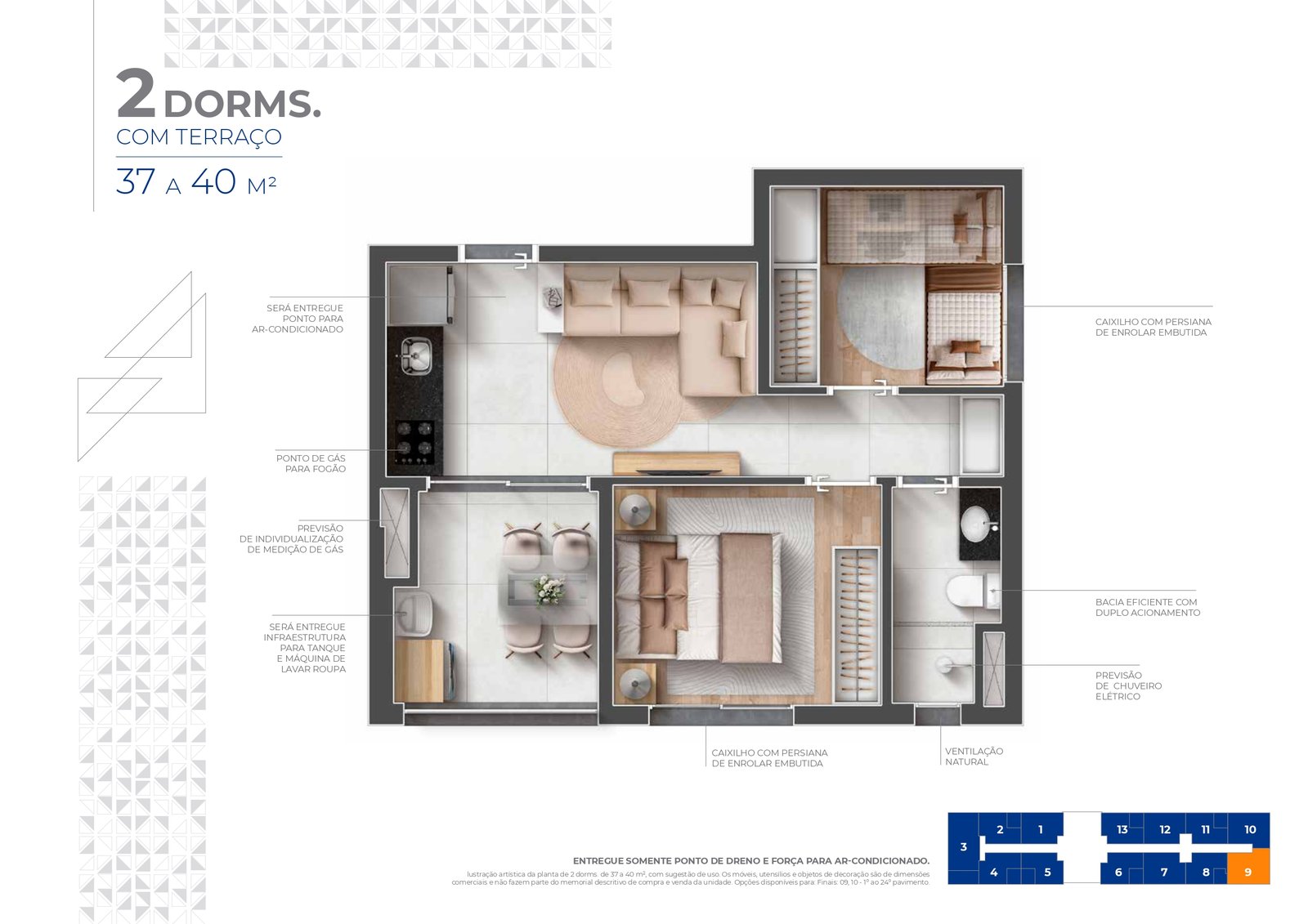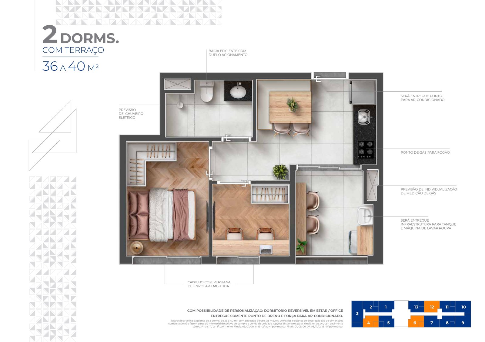 Todas as unidades contam com caixilhos com persianas embutidas, infraestrutura para ar-condicionado, ponto de gás, ventilação natural e varanda integrada ao living.