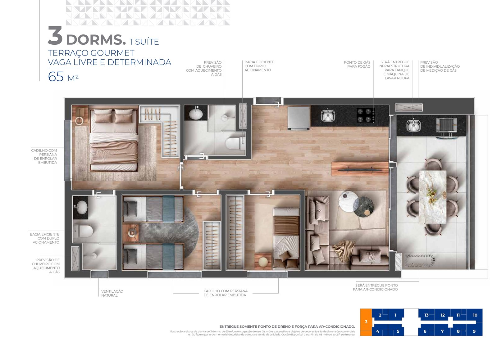 • 3 dormitórios (1 suíte) – 65 m², com terraço gourmet e vaga determinada